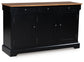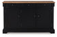 | Details | Made with hardwood solids, mango wood veneer and MDF substrate, Top with butcher block veneer pattern in deep brown wood tone finish, Base with warm satin black finish, Hardware with dark bronze-tone finish, 3 smooth-gliding drawers with felt lining and heavy-duty ball-bearing side glides, 3 cabinets, each with 2 adjustable shelves | |